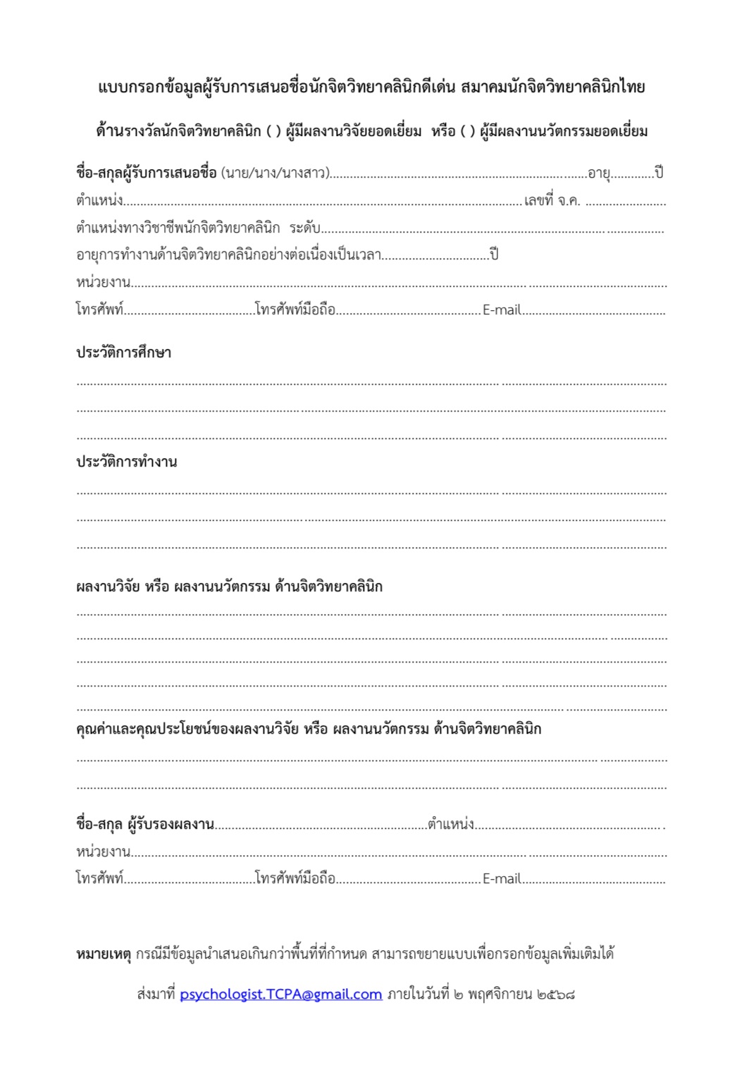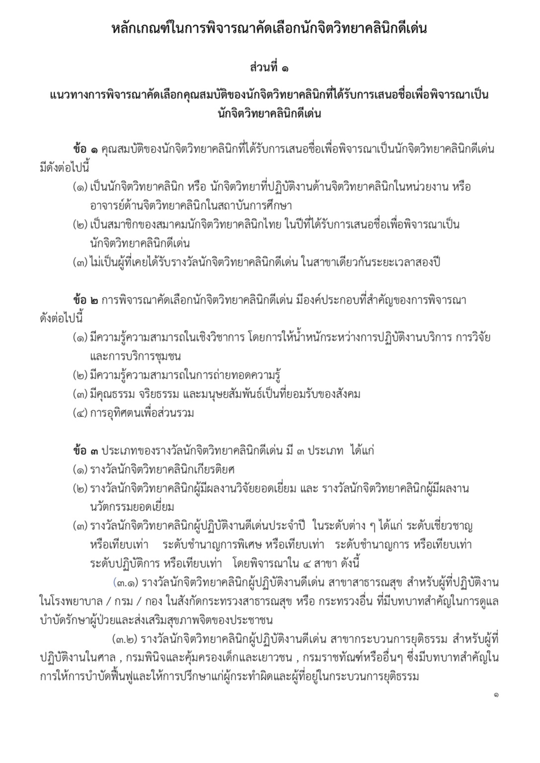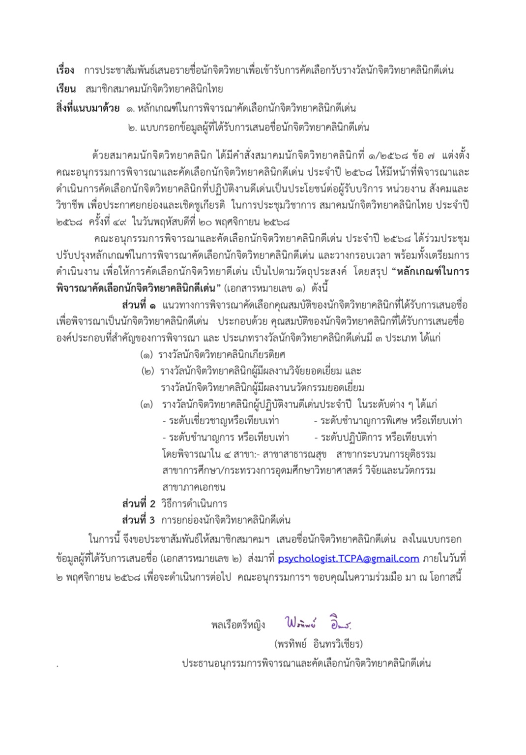 การประชาสัมพันธ์เสนอรายชื่อนักจิตวิทยาเพื่อเข้ารับการคัดเลือกรับรางวัลนักจิตวิทยาคลินิกดีเด่น